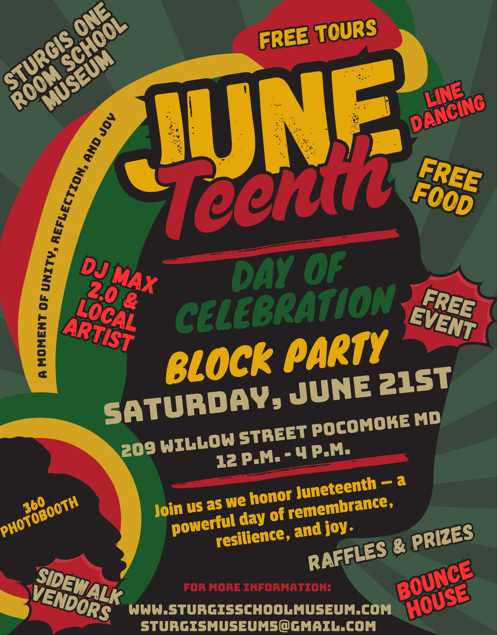 On Saturday, June 21st from 12 p.m. - 4 p.m. at 209 Willow Street in Pocomoke, everyone is invited to enjoy free tours of the Sturgis Museum, door prizes, live performances, a bounce house for kids, music by Charles Smith, DJ Max 2.0, 360 Photobooth, and great food.