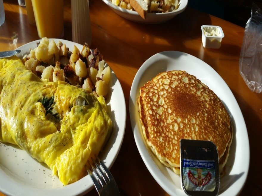 I had the seafood omelette and it was sublime the best I had and if you are wondering if they blend everything together with the eggs they don’t! I hate when they blend but not at the dough roller, the omelette is perfectly soft and stuffed with the delicious crab, shrimp and lobster, my husband had perfect eggs as well no crust on the bottom and melting yoke I would eat there every day. The potato’s were terrible I don’t recommend but it comes with the dish you can’t avoid.